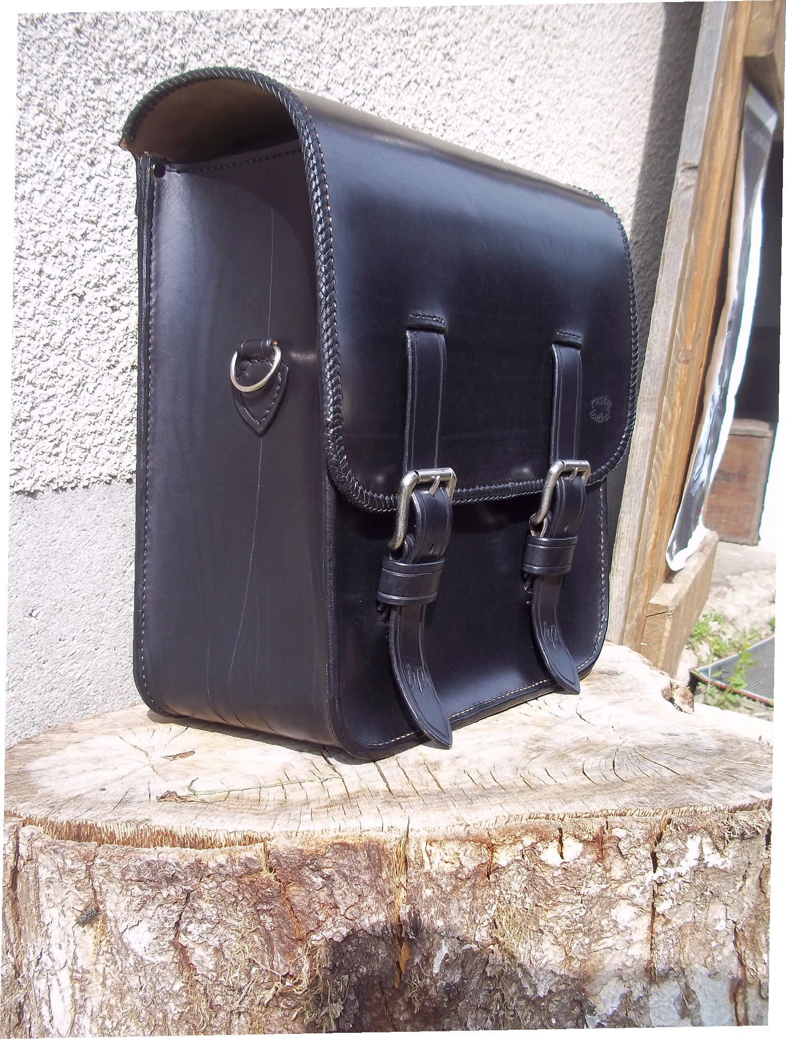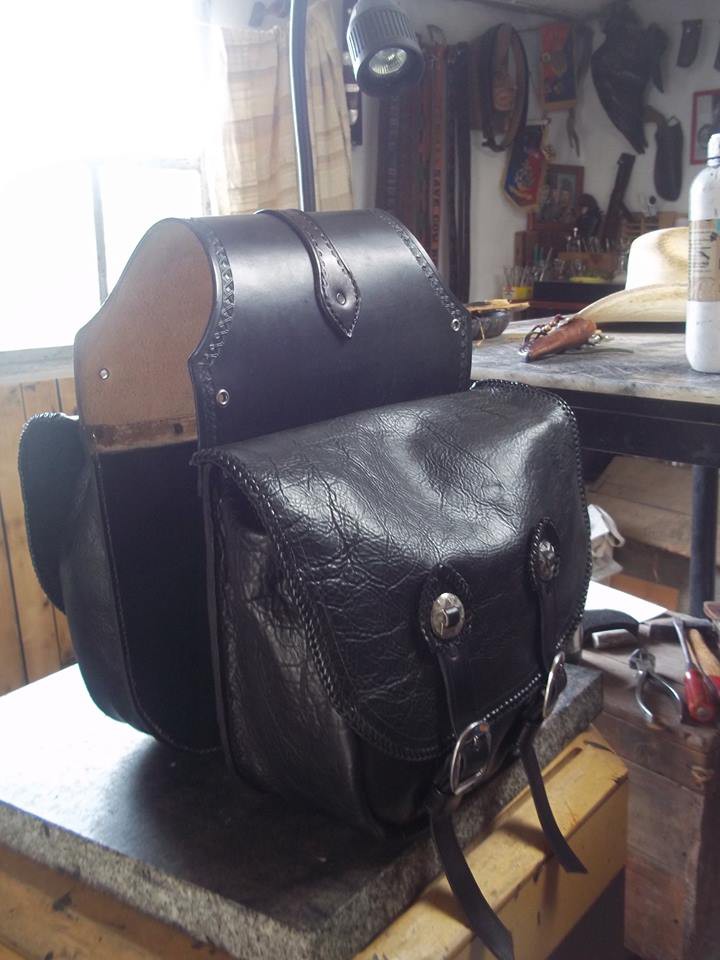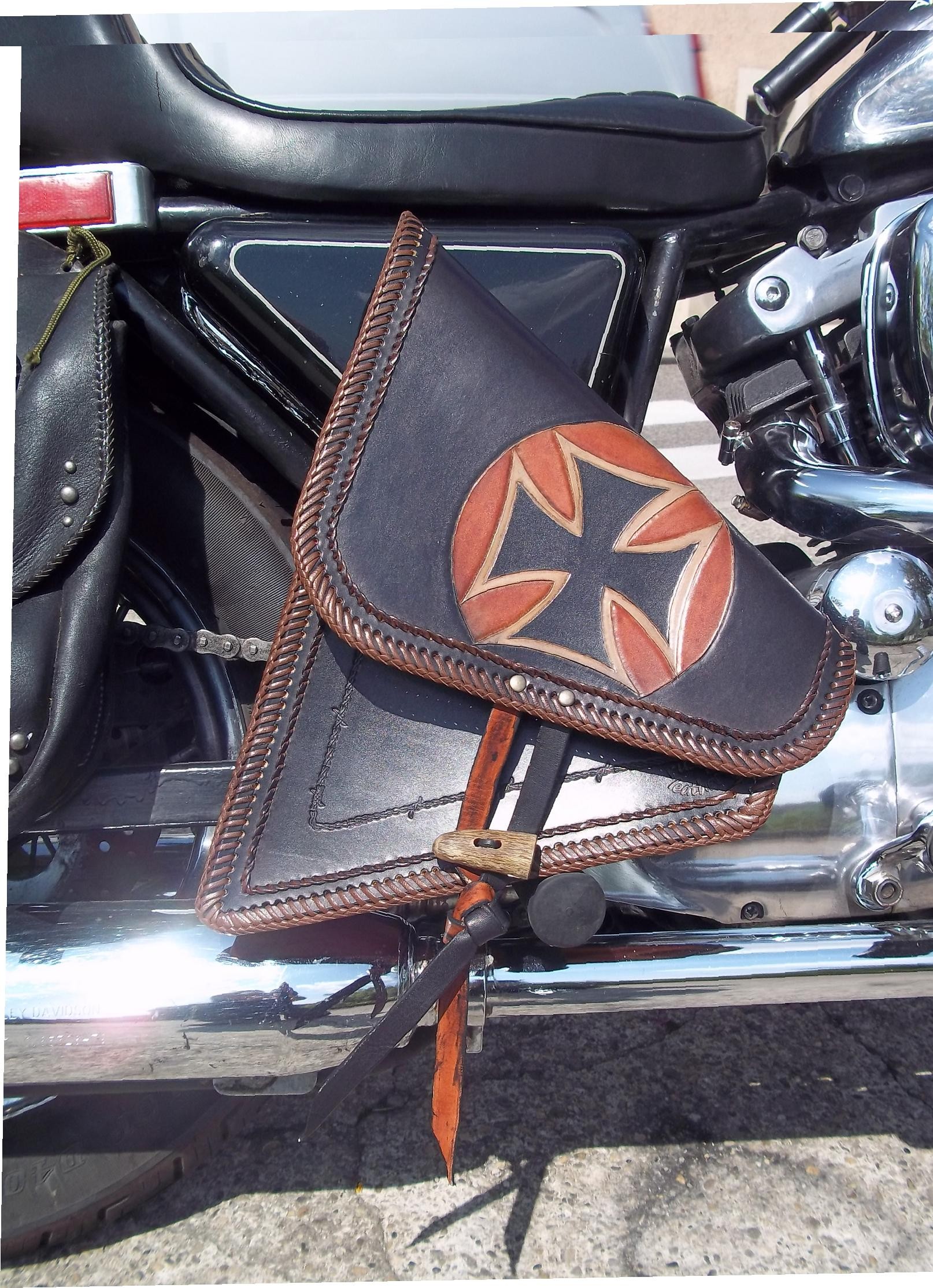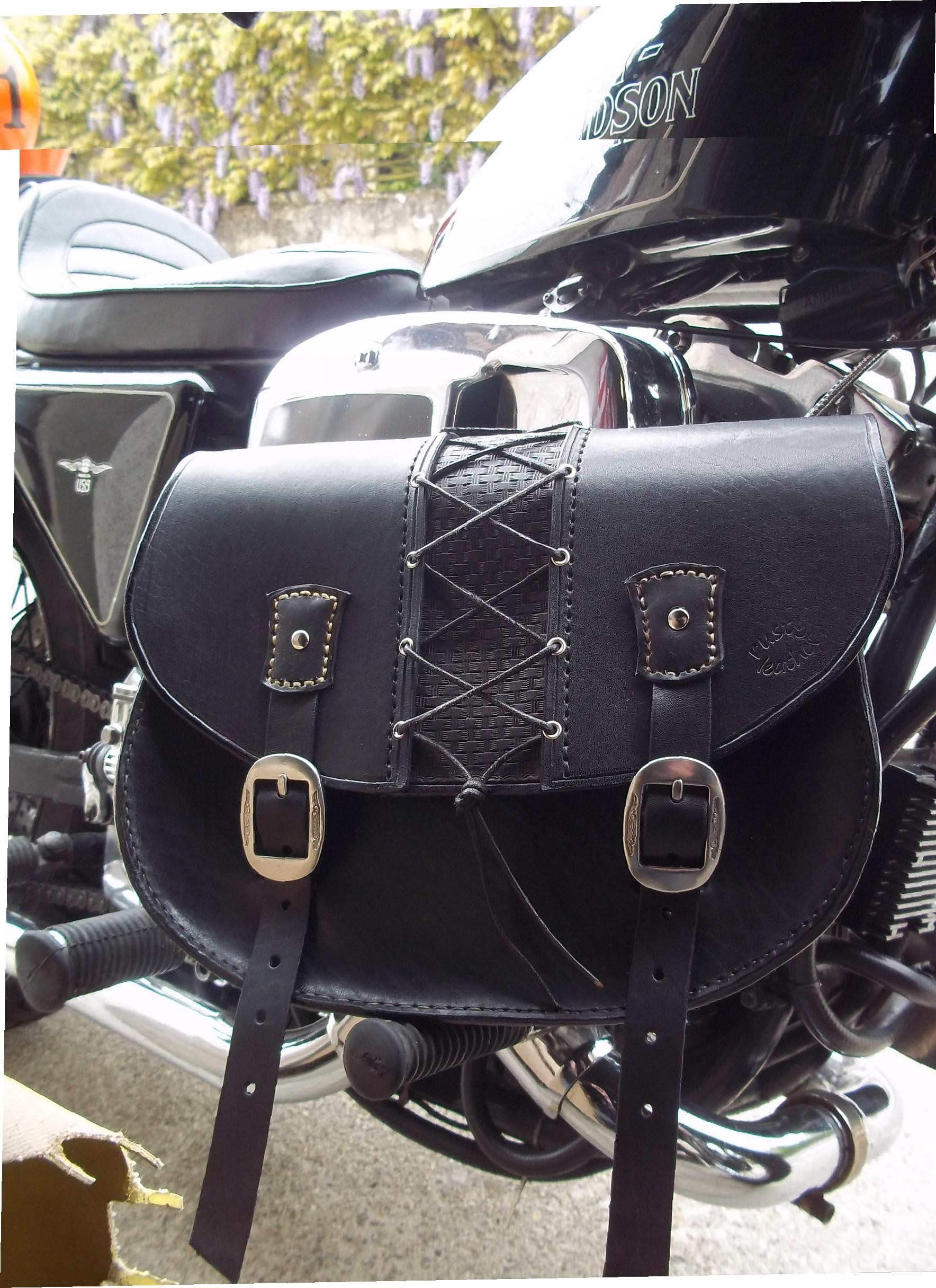 sacoche en cuir entierement faite a la main  pour rigide et softail cuir epais de 3.5 mm double tressage-pro lace en cuir sur toute la sacoche frise...