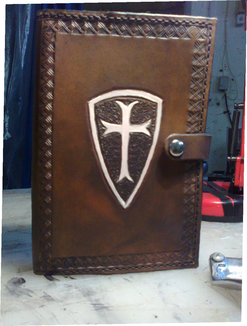 liseuse en cuir faite  100% main -cuuir de 2.5mm nourri a 5% couture sellier-fil ciré croix des templier en cuir repoussé frise decorative...
