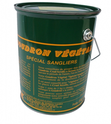 Le vrai goudron de pin épais, à badigeonner sur les arbres près des souilles. Bidon métalique de 5 Kg.