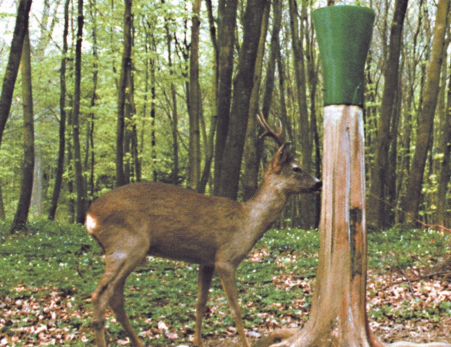 Attractant liquide pour cervidés, chevreuils et chamois. Verser dans le creux d'une vieille souche, lorsqu'elle est plus récente, creuser à la tronçonneuse...