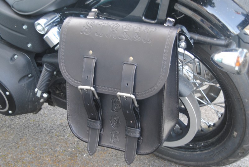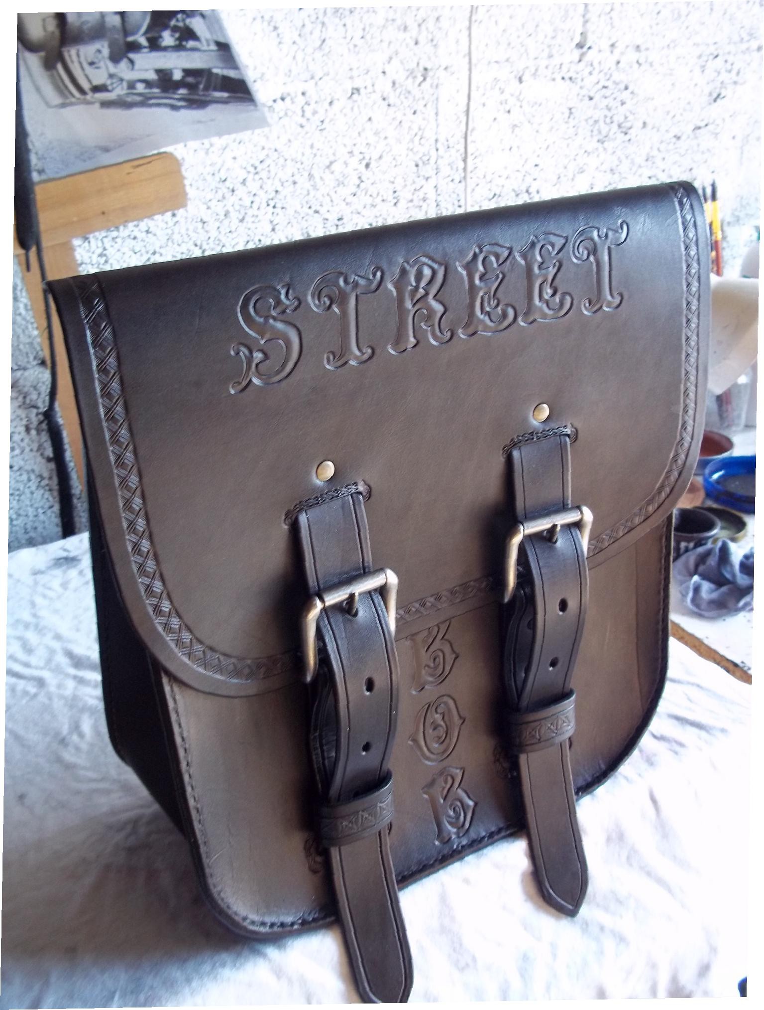 Street -bob  en cuir repoussé - methode de l inverted carving,frise sur le contour du rabas Passants  large  et decoré d une frise