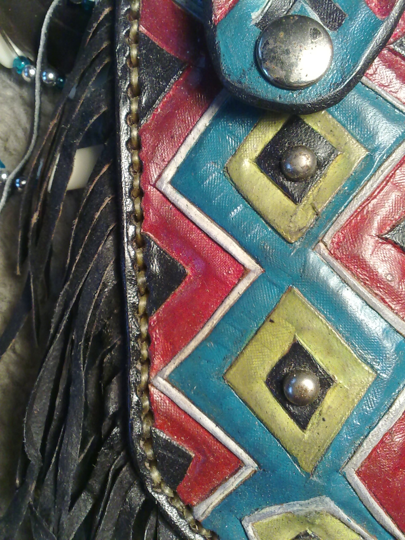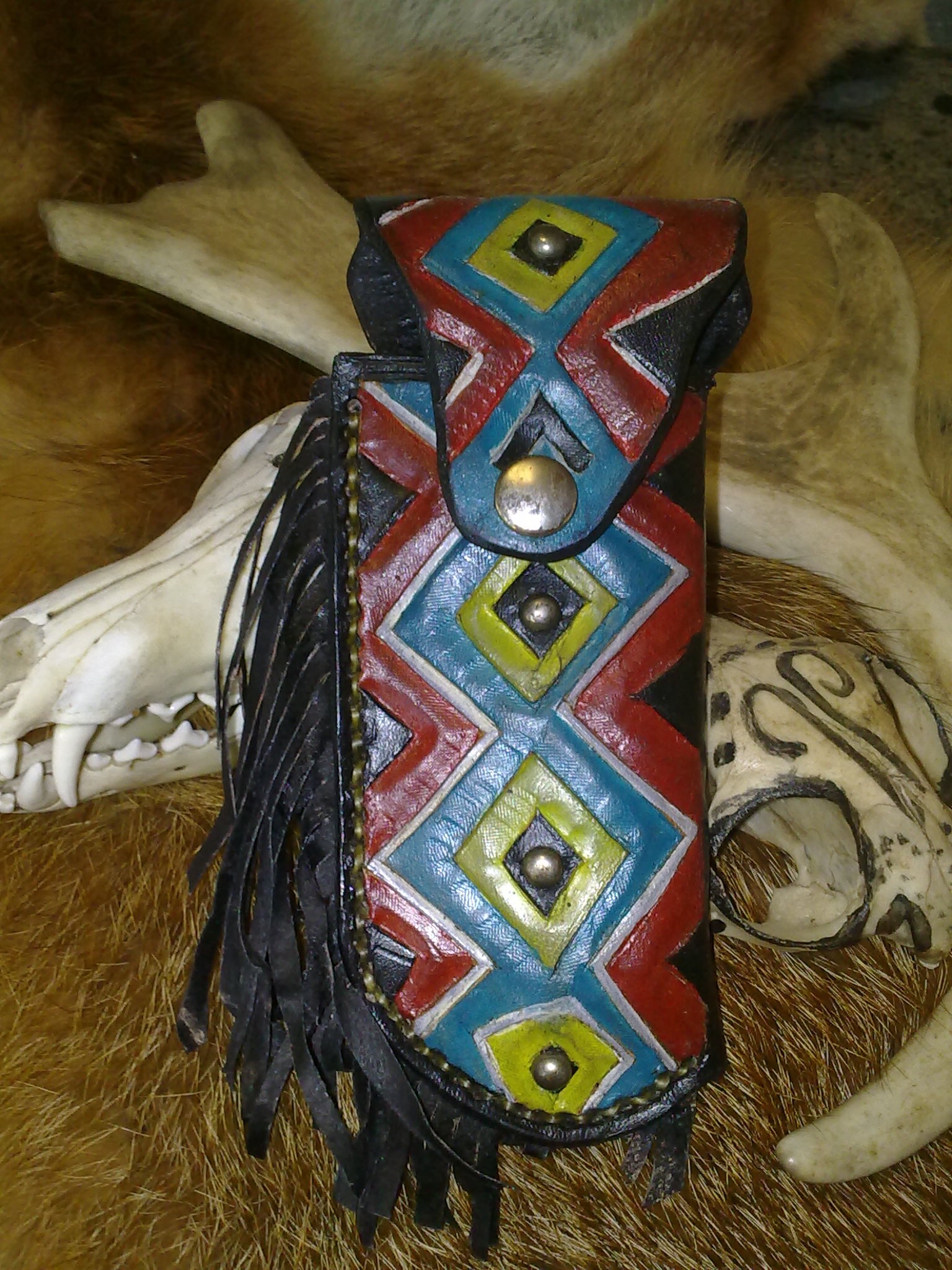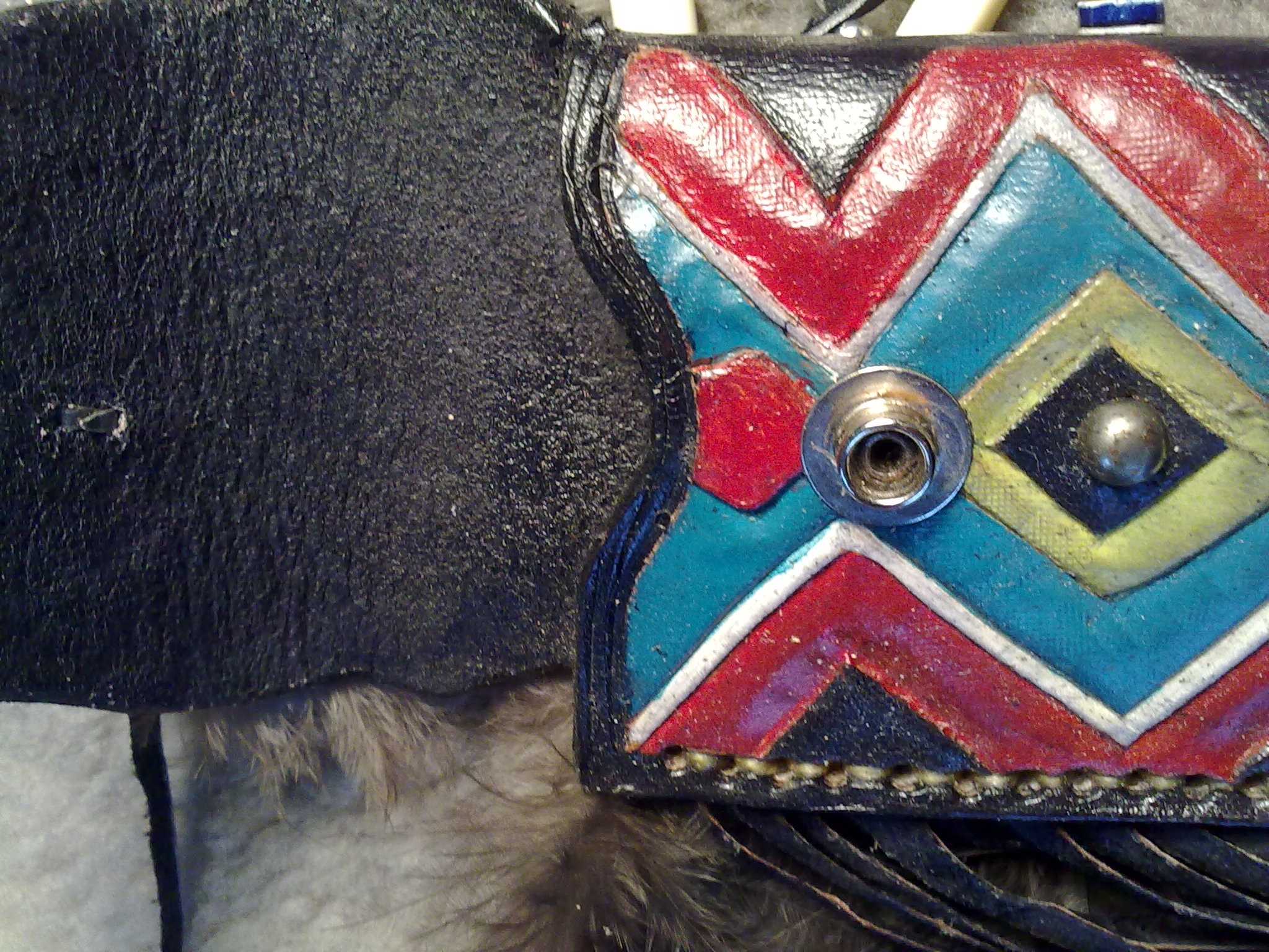 cuir de 3.5 mmm d epaisseur,couture sellier,tranche polisser,teinture acrylique pour motif seminole,passant pour ceinture large.frangé cuir et clouté,finition  super sheene pour un rendu couleur exceptionnel