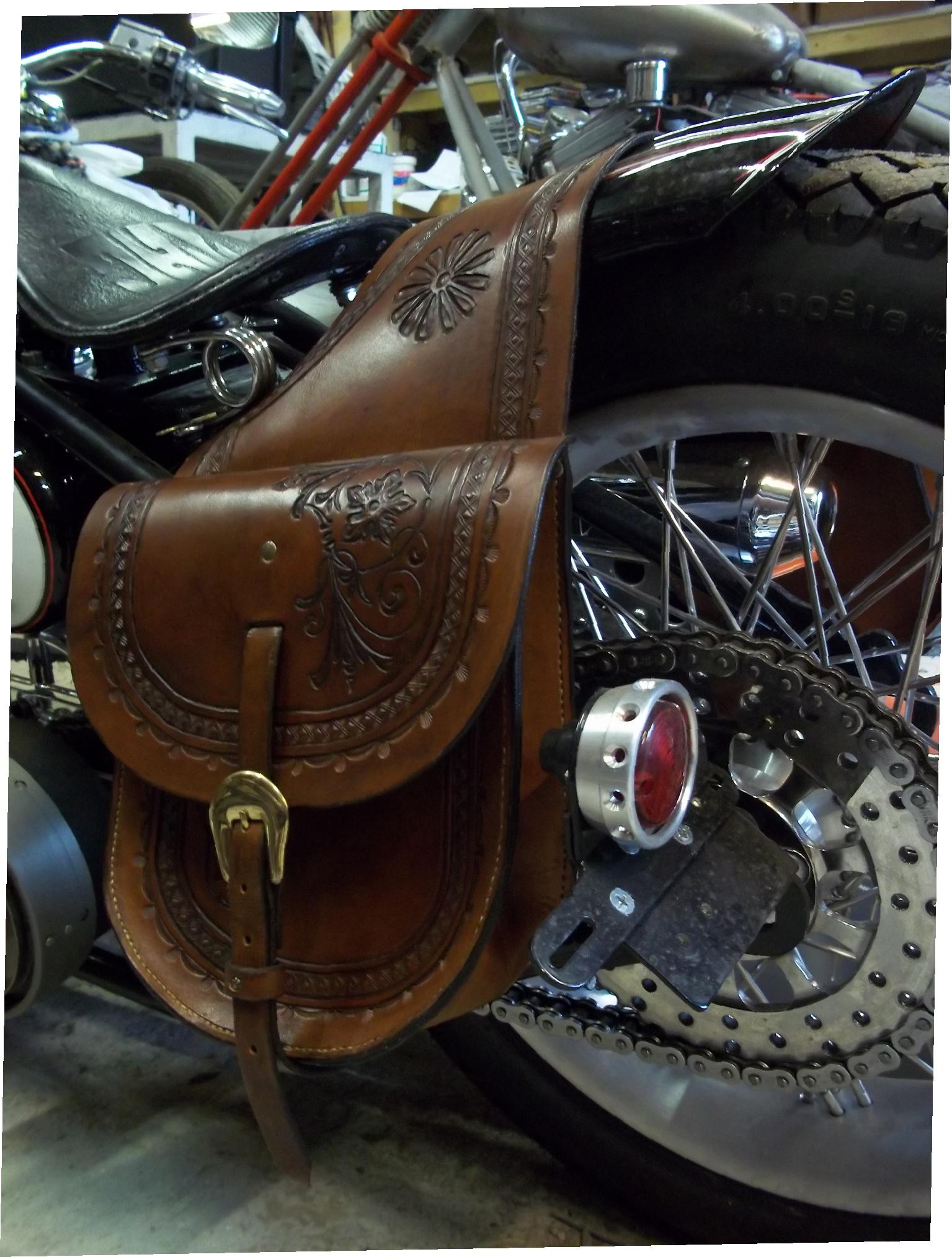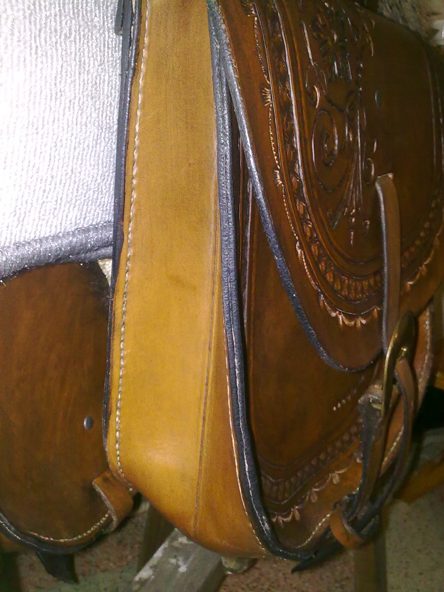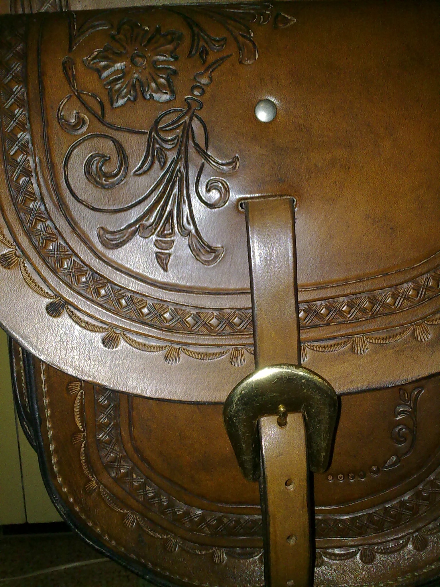 inverted carving ( cuir repoussé) et frise sur tout le tour des sacoches et sur le yoke