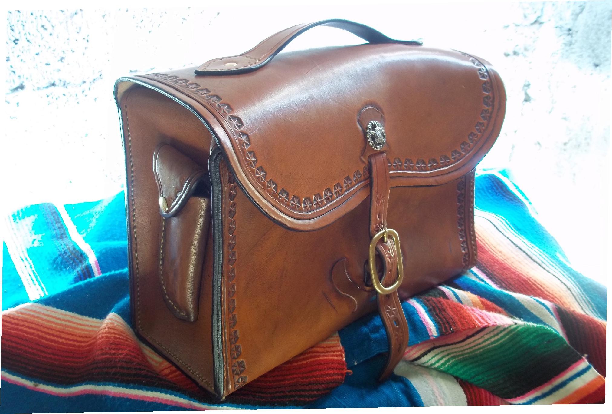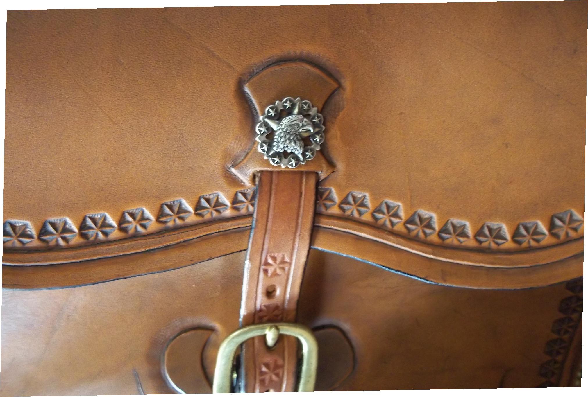 frise sur le poutour de la sacoche ,petit carving au depart et a l arriver de la sangle d attache de 2cm de large,boucle de qualite et inoxcidable  en metal couleur bronze mat