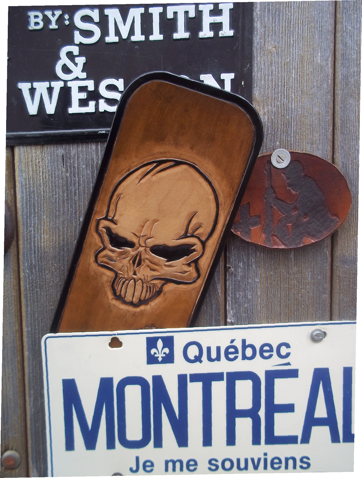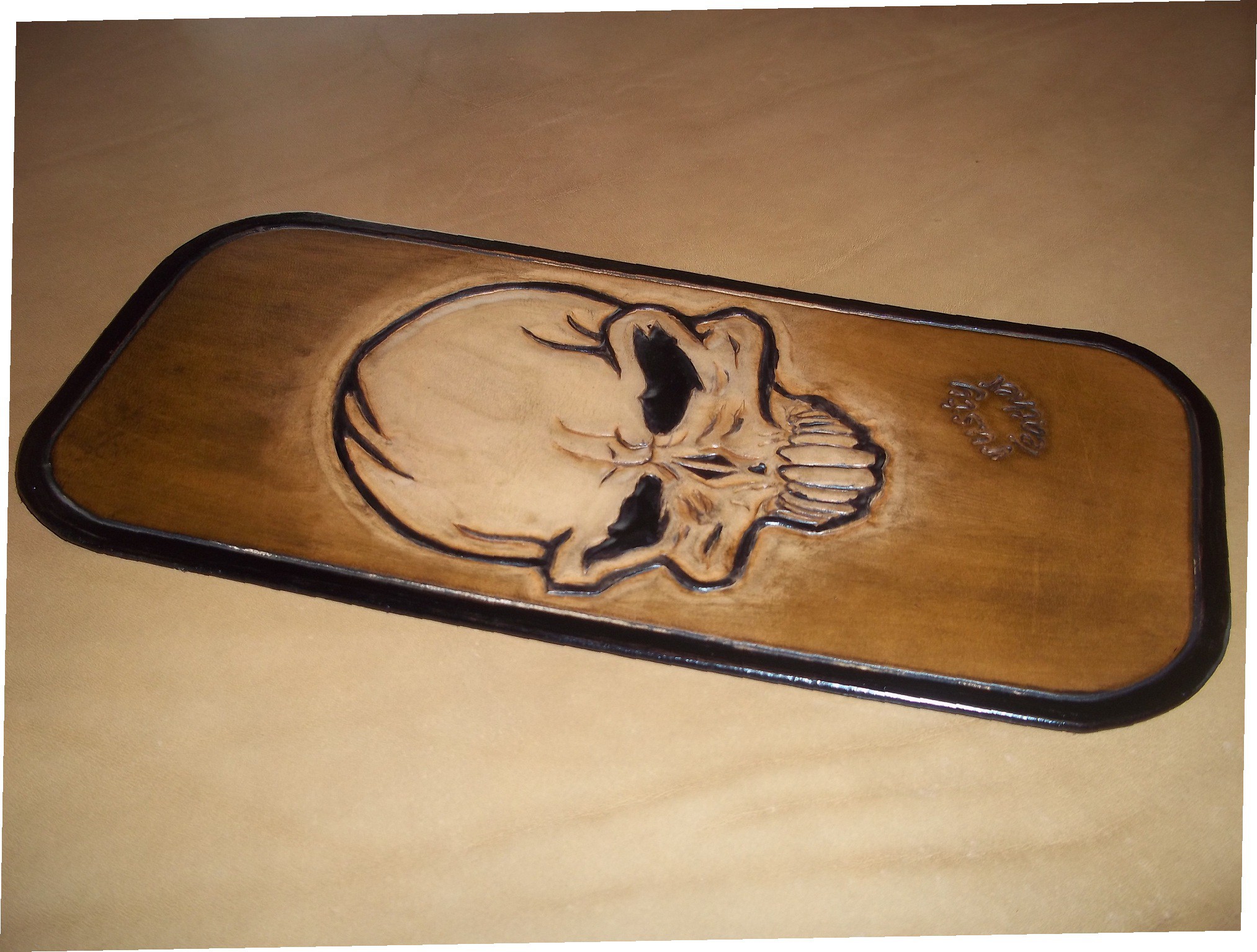 trousse a outil    cuir    pour sportser harley ou autres entierement faite a la main dans du cuir de 3 mm d epaisseur, couture sellier , de meme pour les sangles de fermeture  cette trousse est ciré patiné mais couleur au choix cuir repoussé - model   a votre discrétion apres validation dimension 27 X11   Cm   fixation par sangles -fournies un travaille me model unique ...alors