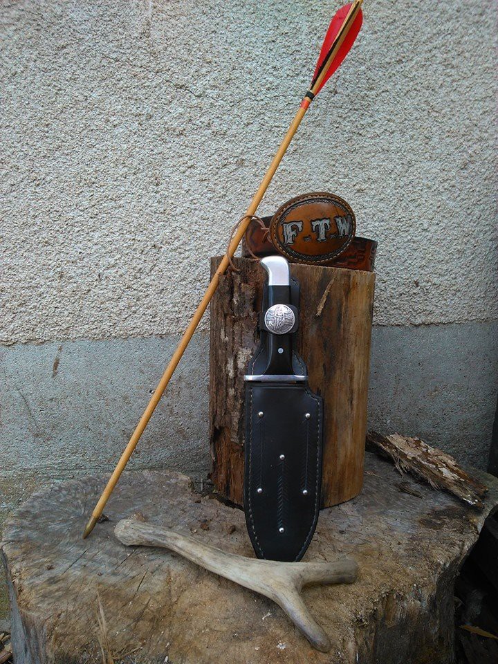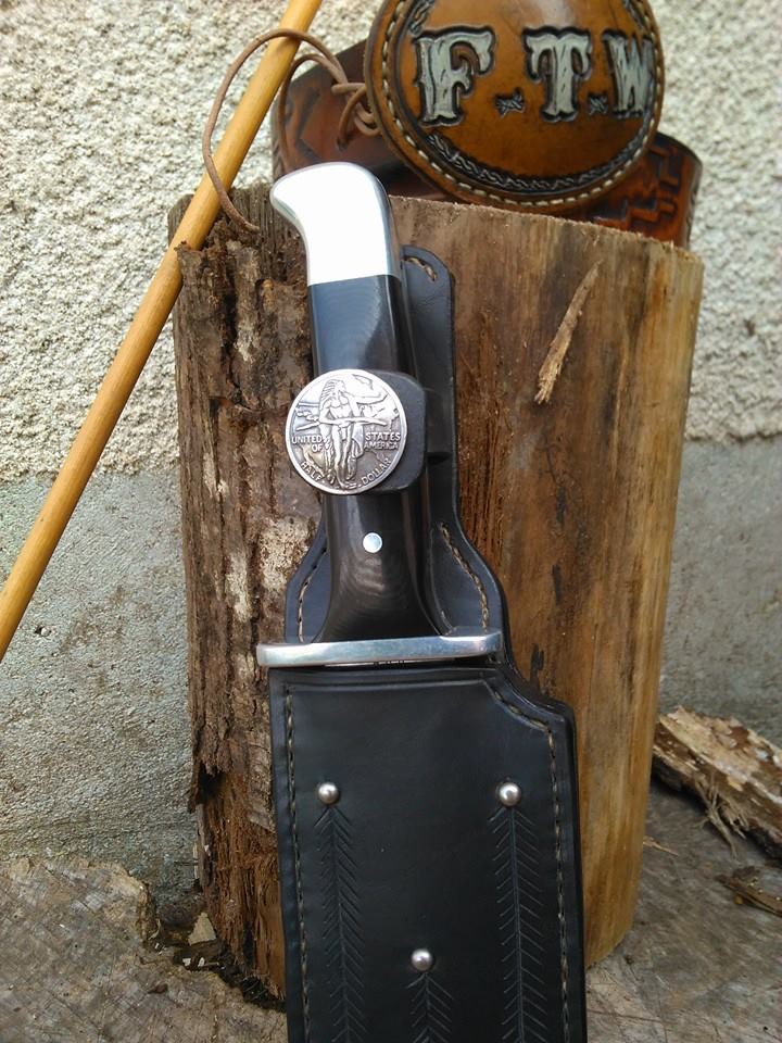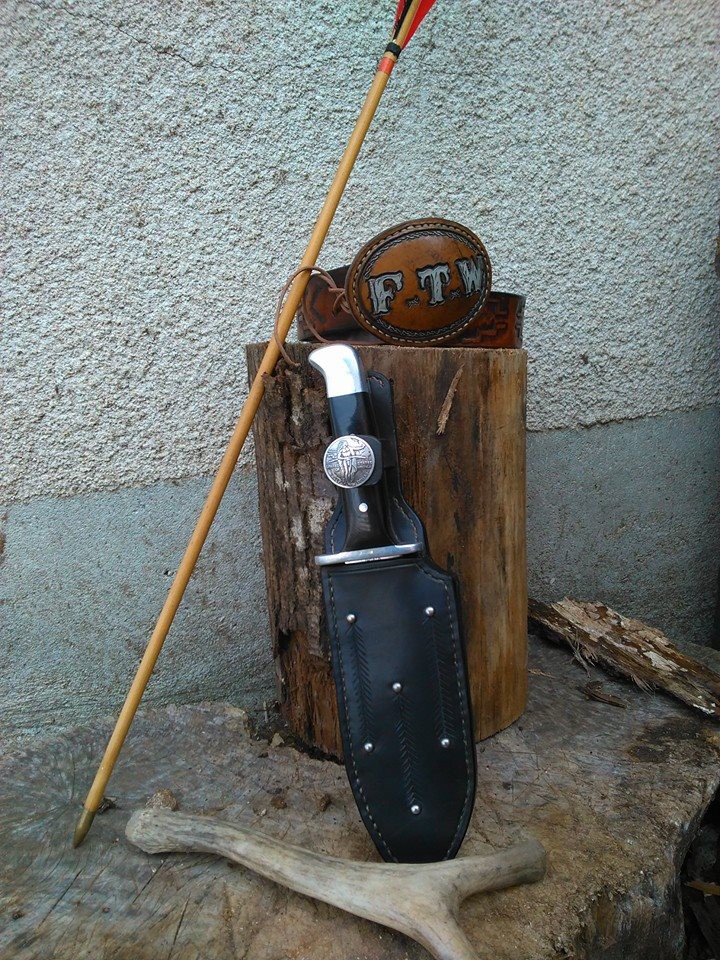 couteau maintenu par le manche par laniere cuir cousu et concho (rare) pression de 24
