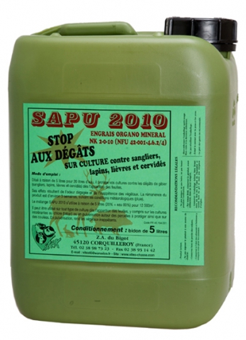 Répulsif/engrais concentré à mélanger avec 4 x son volume d’eau. Pulvérisé , il protège les cultures contre les dégâts du gibier ( sangliers, cervidés, lapins et autres) La forte odeur dégagée rend les végétaux inconsommables. L’efficacité du produit est d’environ trois semaines suivant les conditions météorologiques.